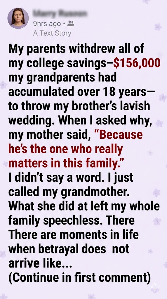 My parents withdrew all of my college savings—$156,000 my grandparents had accumulated over 18 years—to throw my brother’s lavish wedding. When I asked why, my mother said, “Because he’s the one who really matters in this family.” I didn’t say a word. I just called my grandmother. What she did at my brother’s wedding left my whole family speechless.