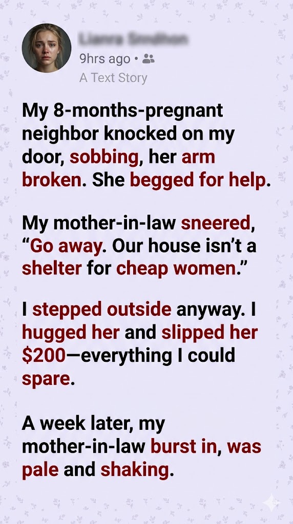 My 8-months-pregnant neighbor knocked on my door, sobbing, her arm broken. She begged for help. My mother-in-law sneered, “Go away. Our house isn’t a shelter for cheap women.”