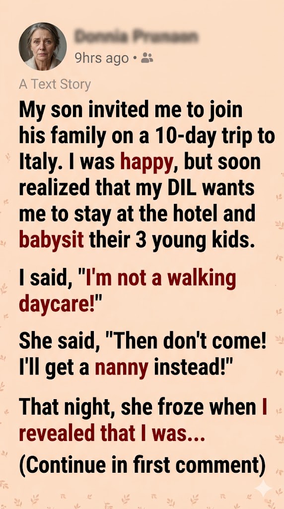 My name is Joyce, a 68-year-old retired widow. This September, my son invited me to join his family on a 10-day trip to Italy, and at first, I was genuinely excited. I imagined it as a chance to bond, create new memories, and feel included in their lives again.