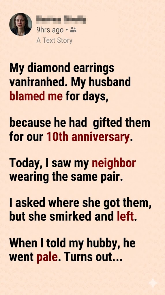 When my diamond earrings disappeared, I immediately blamed myself. I went through every drawer, retraced my steps, and even checked the laundry twice. They were a meaningful gift from my husband for our tenth anniversary—simple yet special. When I told him they were missing, his reaction caught me off guard. Instead of helping me search, he became irritated and distant, emphasizing how valuable they were and how I should have been more careful. For days, an unspoken tension lingered in our home, and I carried a heavy sense of guilt, questioning my own carelessness.