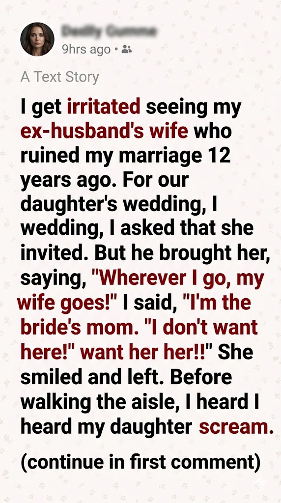 topA Wedding Day That Healed Old Wounds April 9, 2026 - Leave a Comment I get irritated seeing my ex-husband’s wife who ruined my marriage 12 years ago. For our daughter’s wedding, I asked that she not be invited. But he brought her, saying, “Wherever I go, my wife goes!” I said, “I’m the bride’s mom.