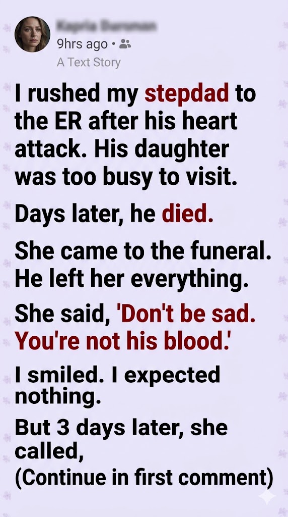I rushed my stepdad to the ER after his heart attack. His daughter was too busy to visit. Days later, he died. She came to the funeral.